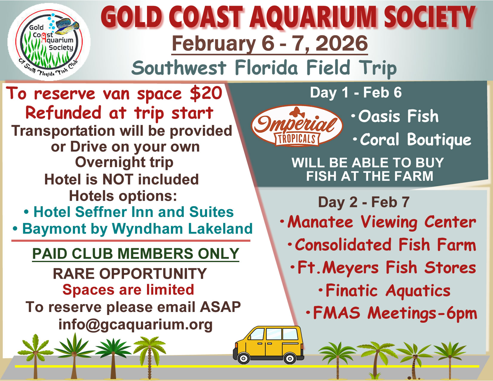 Limited space in van so first come, first serve. $20 deposit for seat on van