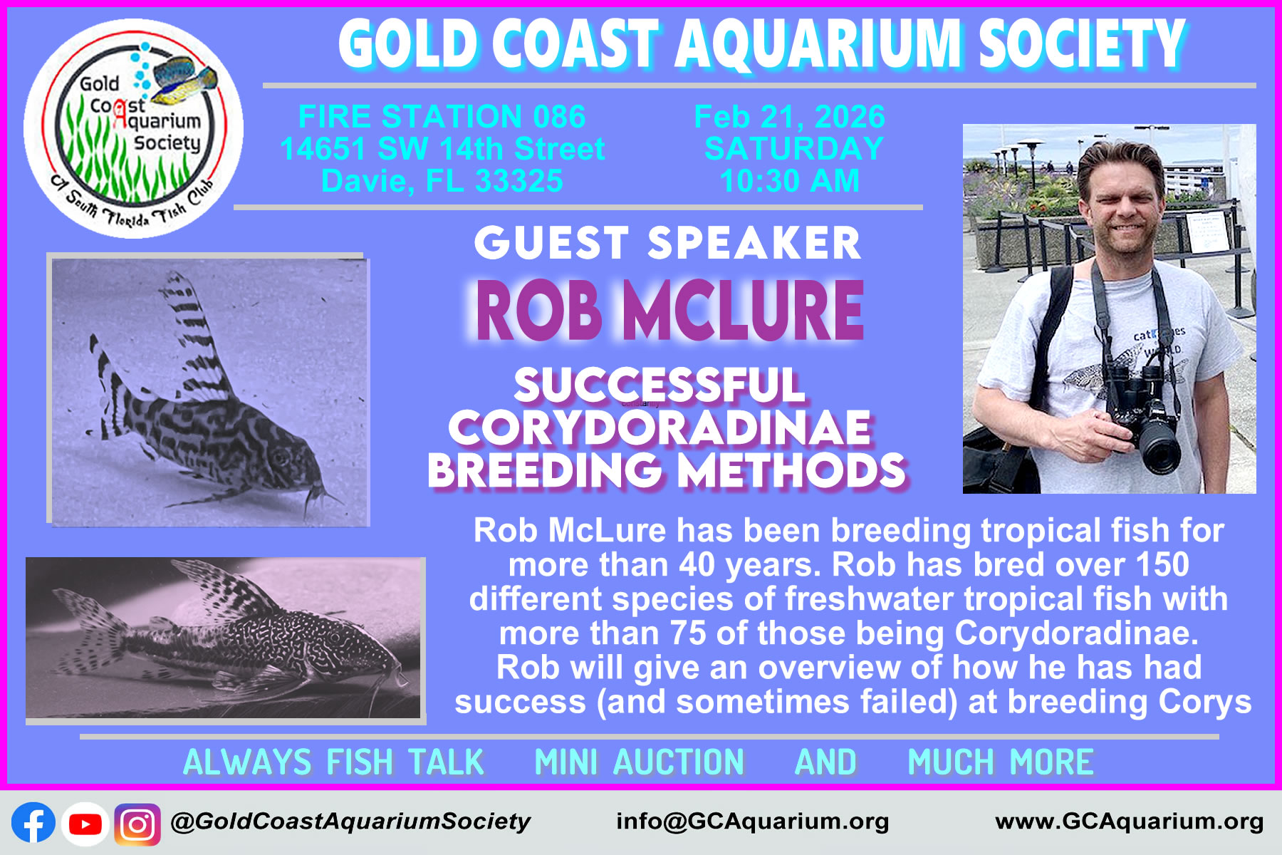 Rob’s presentation is an overview of how he have had success (and sometimes failed) at breeding Cory. Everyone, from the most basic beginner to the skilled catfish breeder should be able to get something from it.